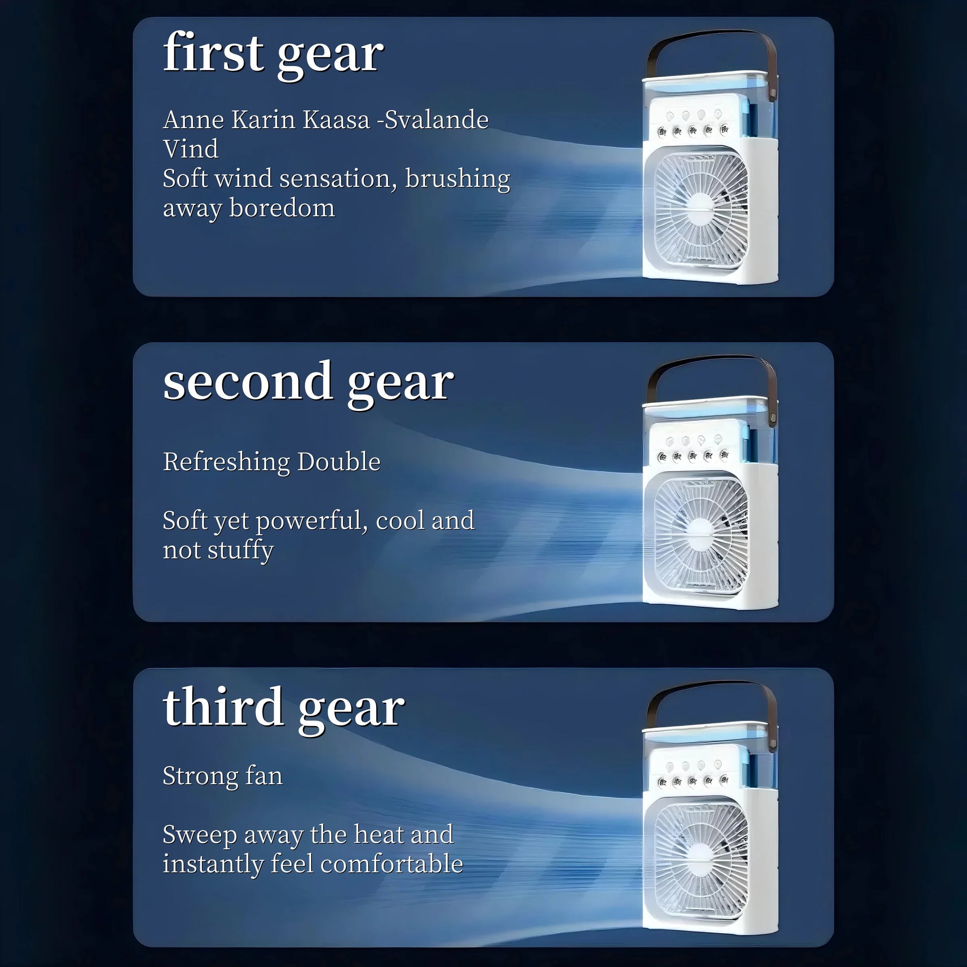 * 7 COLORS AND LOW NOISE: This portable air cooler fan uses a 7-color light design to provide soft lighting. Turn on* 3-IN-1 FUNCTION: It contains the functions of a fan, air conditioner and air humidifier. If you feel that the air is very dry and hot, just buy it. It is not only a personal air cooler, but also an air humidifier. In the hot summer, when you add ice and water to the sink, you will feel the cool air and enjoy the icy summer. At the same time, in autumn and winter, it humidifies the air.